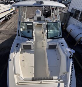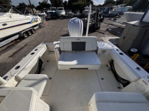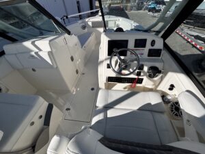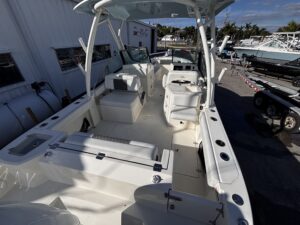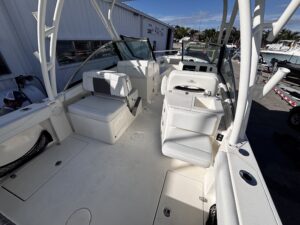 The 2025 Cobia 240 DC is a versatile 25-foot dual-console boat designed for both family cruising and serious fishing. Measuring 25 ft 1 in long with an 8 ft 10 in beam and powered by up to 350 hp, it combines comfort, performance, and practicality. With a 123-gallon fuel capacity and a 21.5u00b0 deadrise hull, it offers solid handling in varied conditions while remaining easy to trailer. The layout features plush seating for up to nine passengers, a walk-through bow, a convertible lounge, and a hideaway aft bench, making it ideal for relaxing or entertaining. Anglers will appreciate the dual in-floor 24-gallon fish boxes, 22-gallon livewell, rod holders, and bait prep station, while families will enjoy conveniences such as a walk-down head with sink, USB ports, and freshwater washdown. Available with premium options like a hardtop, Garmin electronics, and digital steering, the 240 DC is equally suited for offshore adventures or leisurely day trips. Overall, itu2019s a well-balanced, high-quality boat that offers comfort, capability, and craftsmanship in a manageable size.